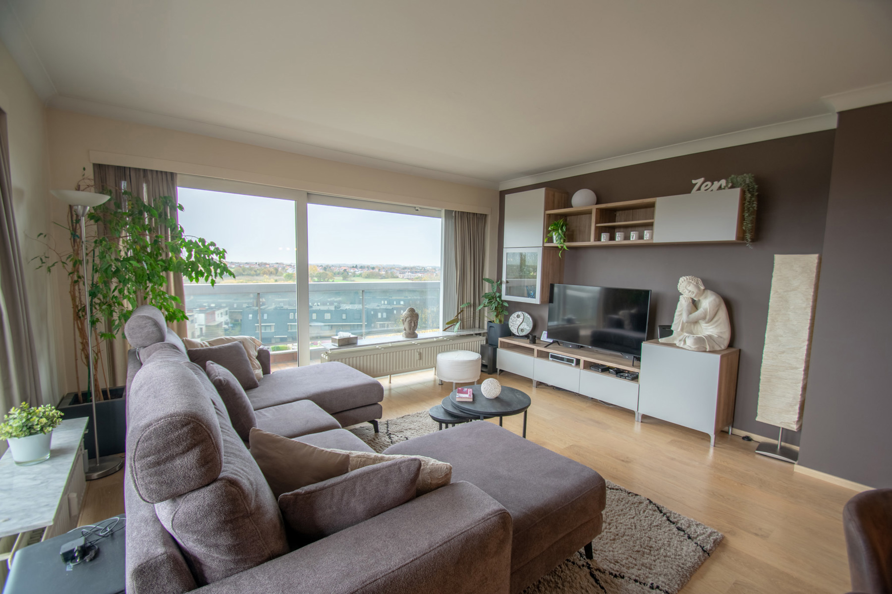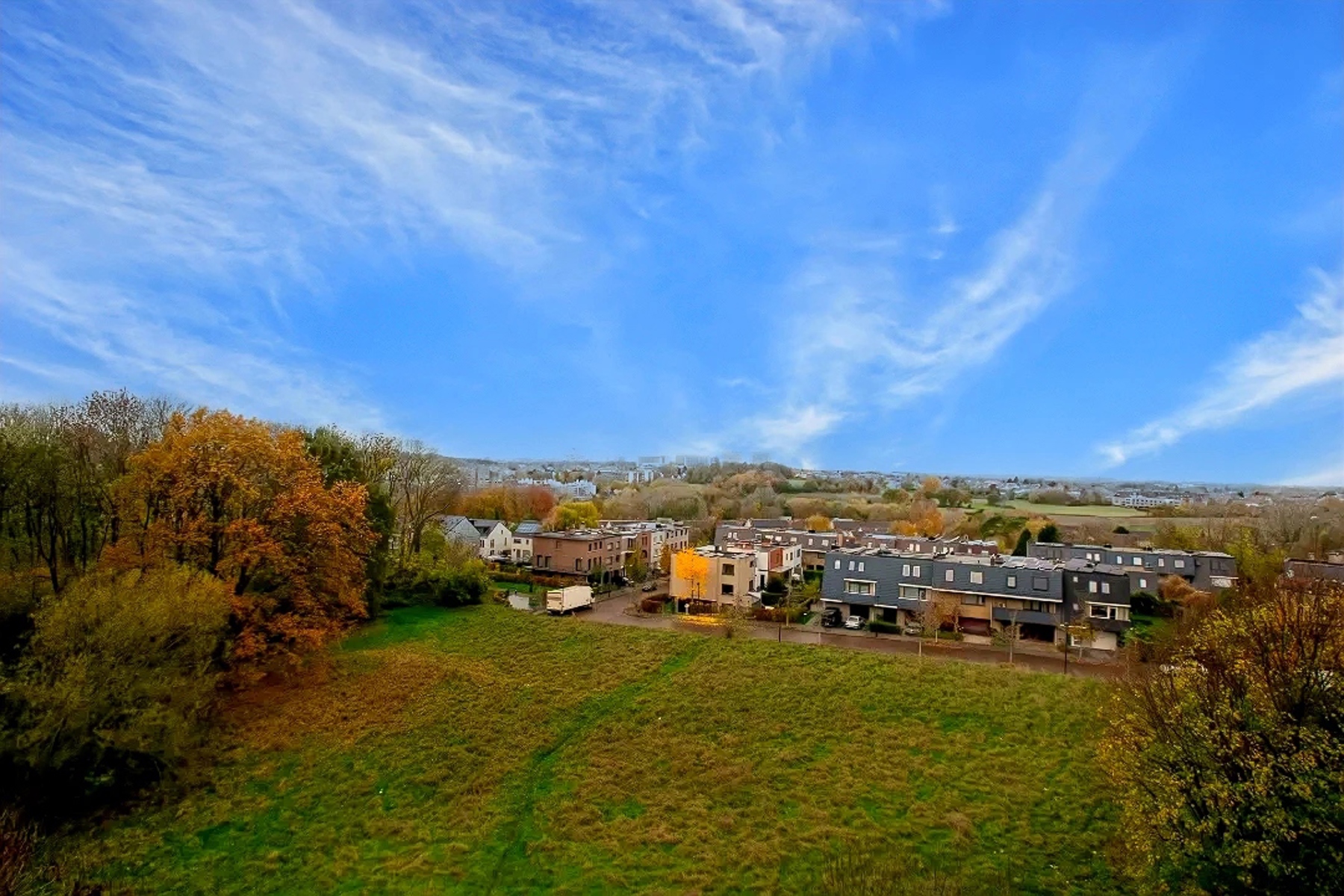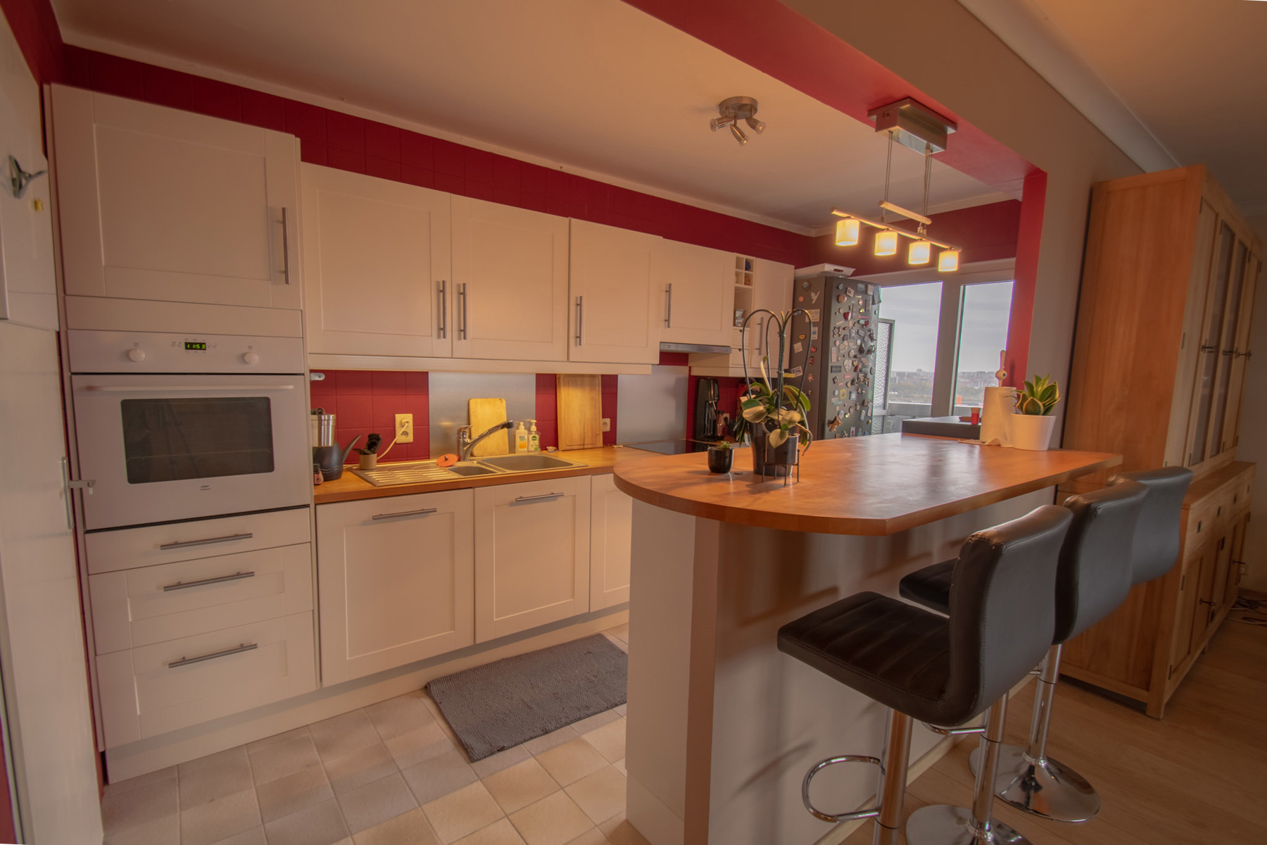Bij het binnenkomen wordt u verwelkomd door een aangename inkomhal die leidt naar een ruime, lichte leefruimte met een volledig ingerichte open keuken, wat een open en gezellige sfeer creëert. De woonkamer geeft toegang tot een groot terras dat rond de leefruimte en de keuken loopt, ideaal om op elk moment van de dag van de zon te genieten en de stad vanop hoogte te bewonderen.