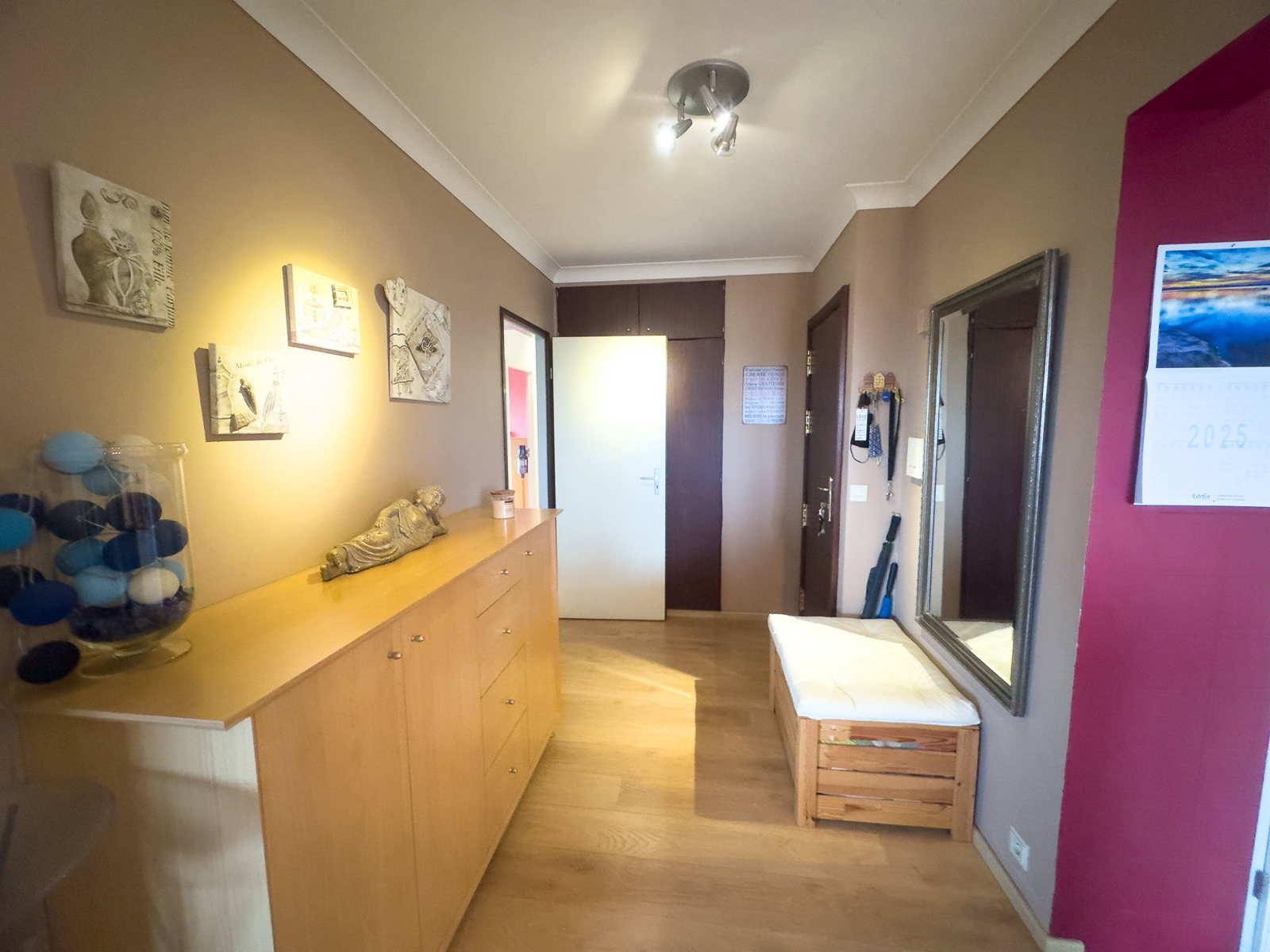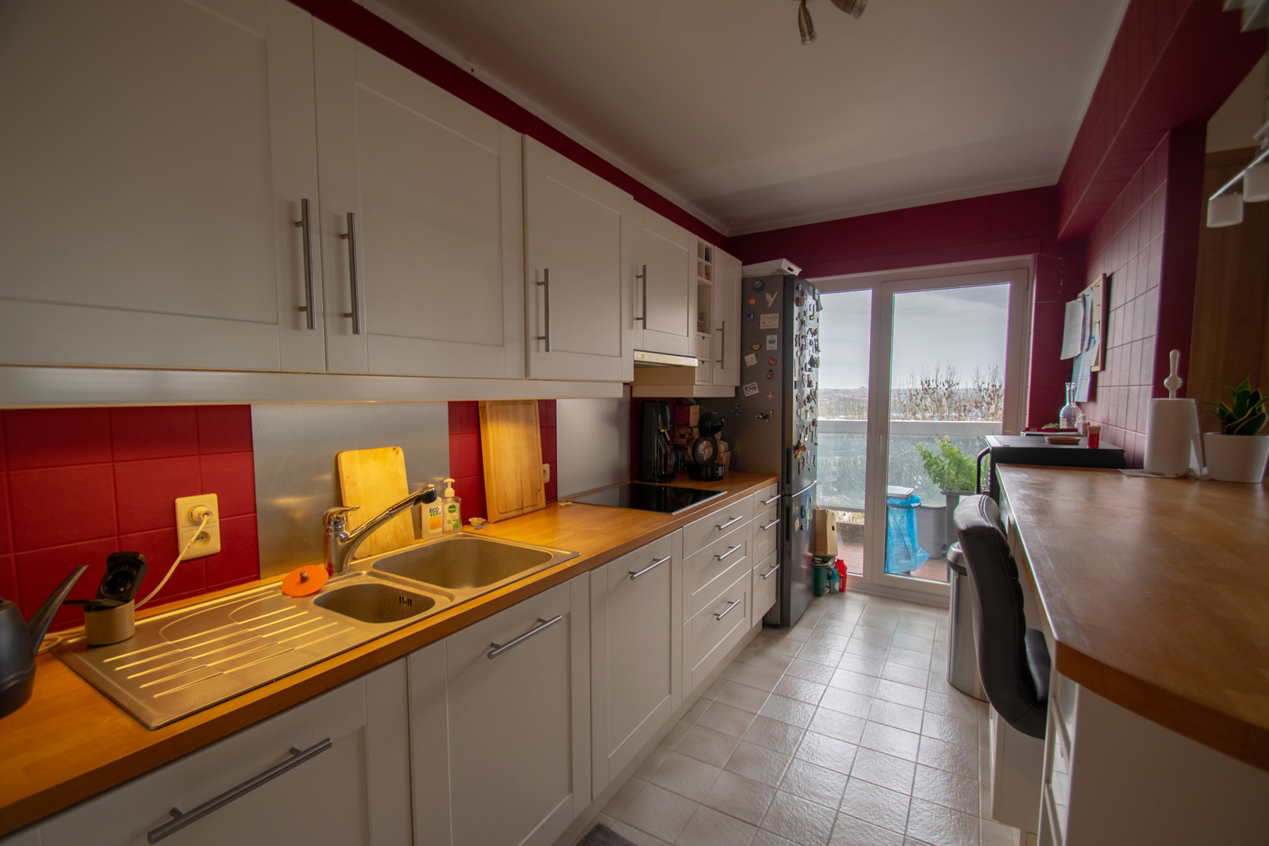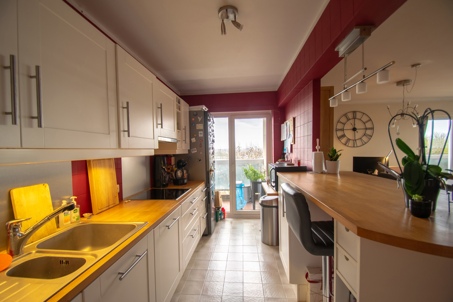 Bij het binnenkomen wordt u verwelkomd door een aangename inkomhal die leidt naar een ruime, lichte leefruimte met een volledig ingerichte open keuken, wat een open en gezellige sfeer creëert. De woonkamer geeft toegang tot een groot terras dat rond de leefruimte en de keuken loopt, ideaal om op elk moment van de dag van de zon te genieten en de stad vanop hoogte te bewonderen.