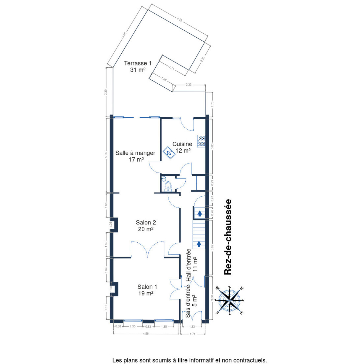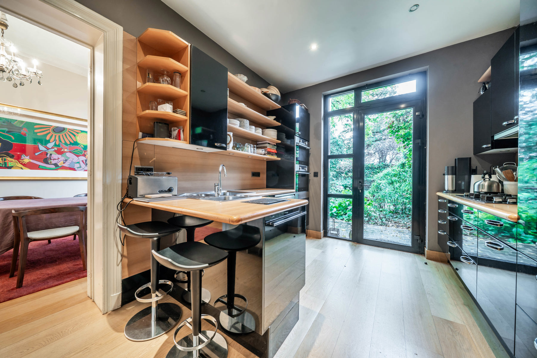 Het gelijkvloers biedt prachtige ontvangstruimtes in enfilade – dubbele salon en eetkamer – badend in natuurlijk licht, aangevuld met een volledig ingerichte keuken en een apart toilet.